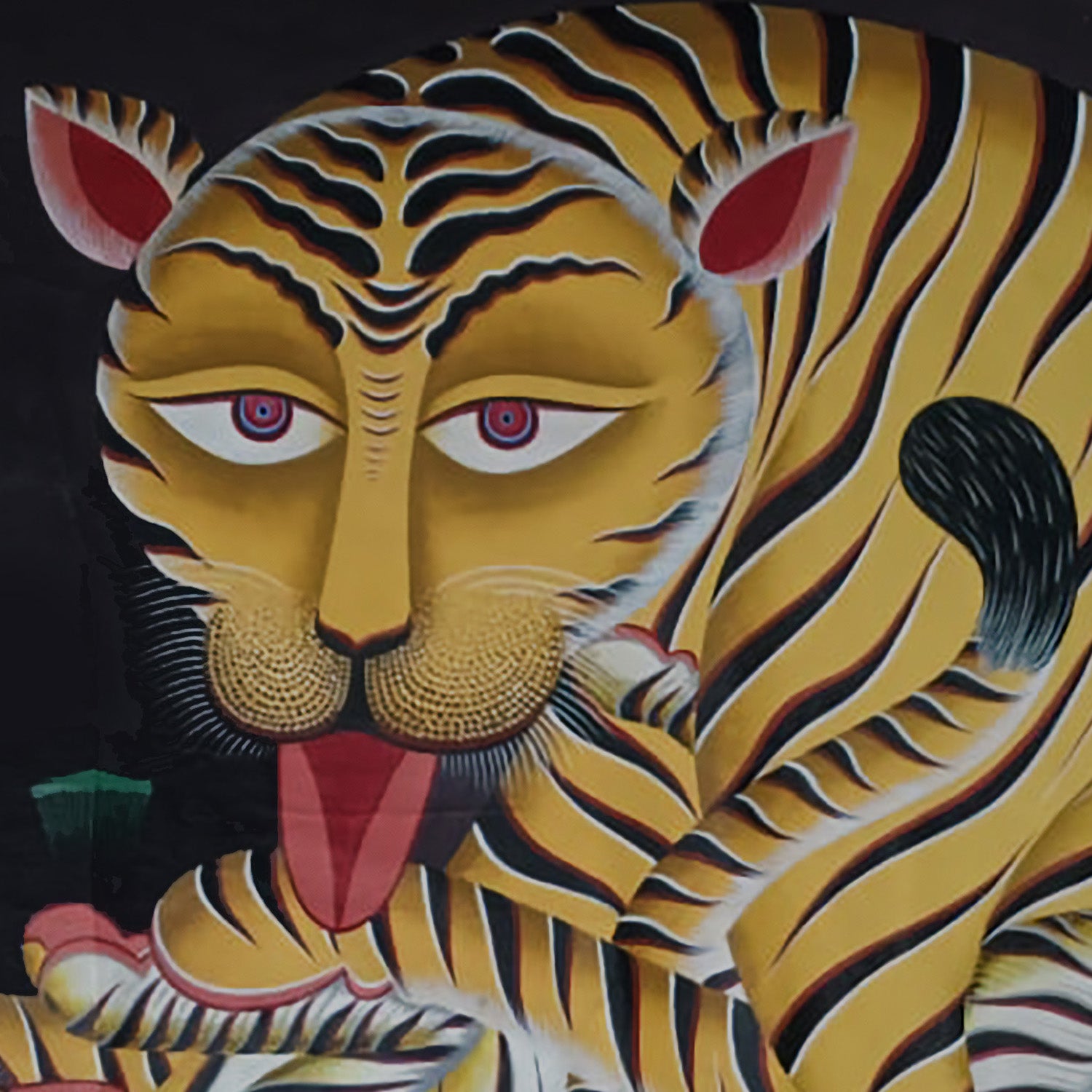 "This stunning work by Kalighat painter Anwar Chitrakar is a beautiful display of the artistic form. In it we see the trademark, flat perspective being employed to depict the scene of a loving mother Tigress with her cub. The vibrant yellow of the two figures and the dark black lines, that are another key feature of the art style, ensure that the eye is drawn to the centre of the painting. In the background we can see clumps of grass that take on an almost jellyfish-like pattern against the stark black of the paper. Tigers have long been a topic of great reverence in Bengal with the tiger becoming the national animal of our country. Additionally, this curved composition of the tiger, which is very common when depicting ordinary housecats in Kalighat painting, is used here to add a playful frivolity to the scene. "
