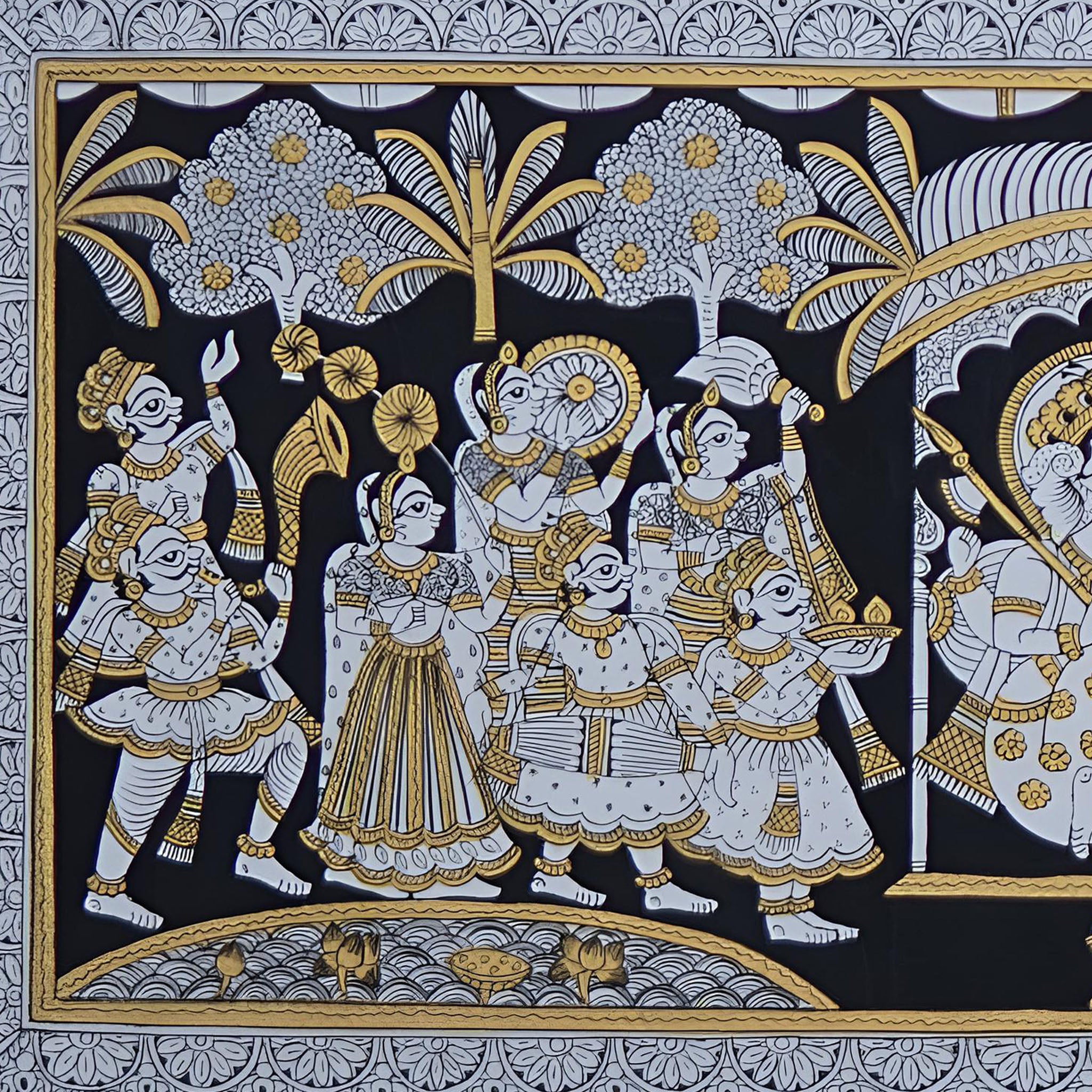 The artwork hand-painted by Kalyan Joshi, is made in the traditional style of Phad painting. The tableau depicts Lord Ganesh Vandana, an invocation to Lord Ganesh, a Hindu god of all Beginnings. The auspicious vandana is recited at the beginning of any ritual or to mark the beginning of any new venture. Here the artist has portrayed Ganesh in the traditional iconography. He is shown with an elephant head and seated contentedly on his Vahana-Mushak, surrounded by his worshippers. He has used natural stone colors on paper to portray this horizontal depiction of the Vandana so as to evoke Bhakti Rasa (feeling of devotion). The palette consists of deep colors and bold lines and all the figures are shown having exaggerated features.