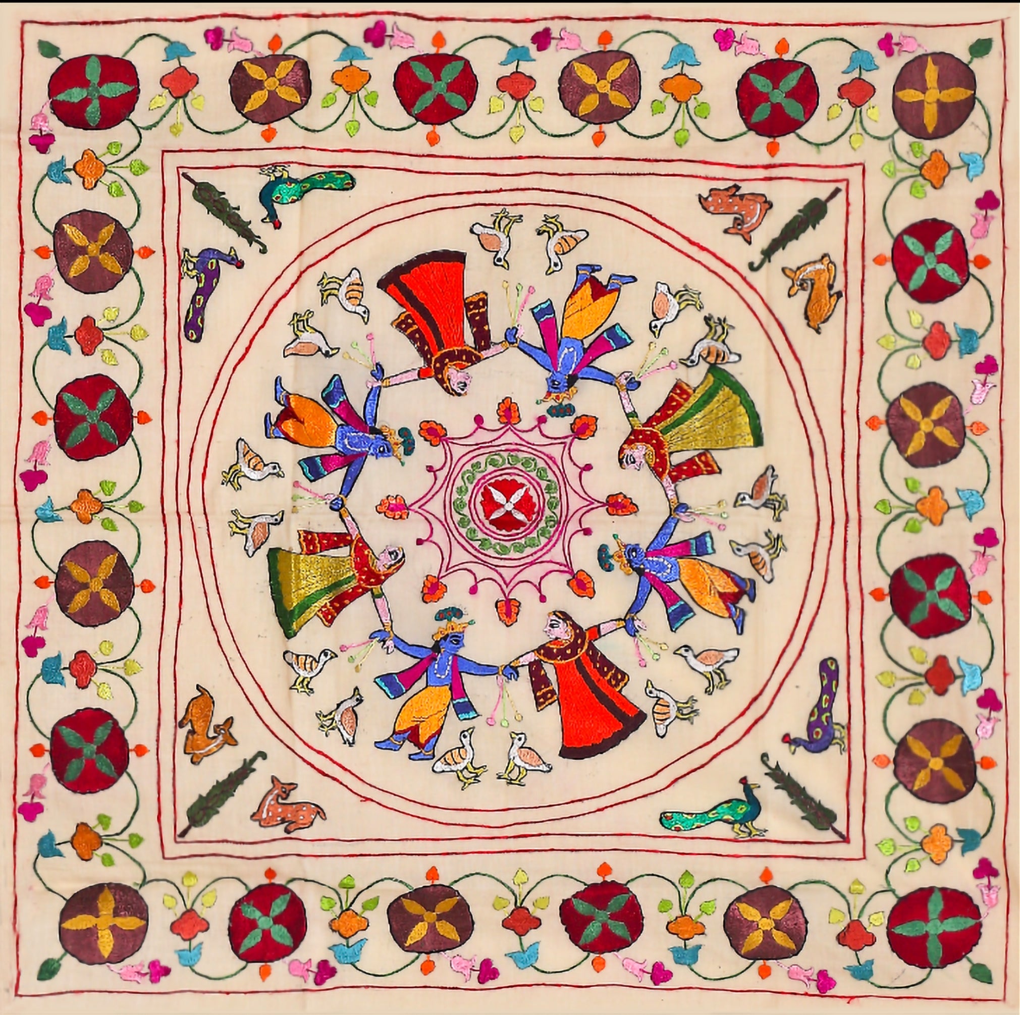 The artwork depicts the Raas Mandal reimagined by the Lalita Vakil’s skillful needle. She portrays an exquisite work of art that transports the viewers to the enchanting world of divine love and celebration. At its heart, a central embroidery in rich hues of red and green takes center stage, a resplendent flower that serves as the focal point of this intricate artwork. This magnificent flower symbolizes the core of the Raas Mandal, radiating its vivid colors and vibrant energy. The border of the painting is adorned with the regal peacock and the gentle deer. The peacock, with its vibrant plumage, represents the allure of love, while the deer's presence signifies gentleness and grace. The entire composition is further enhanced by motifs of different flowers connected with intricate vines that wrap around the central scene. The colors used in the embroidery are vibrant, with shades of red, blue, green, and yellow predominating. The delicate embroidery is done on a square piece of cotton cloth using silk threads. Here the artist has employed a unique technique called do-rukha or double-sided embroidery, where the designs are embroidered on both sides of the fabric, resulting in a reversible and equally captivating piece of art.