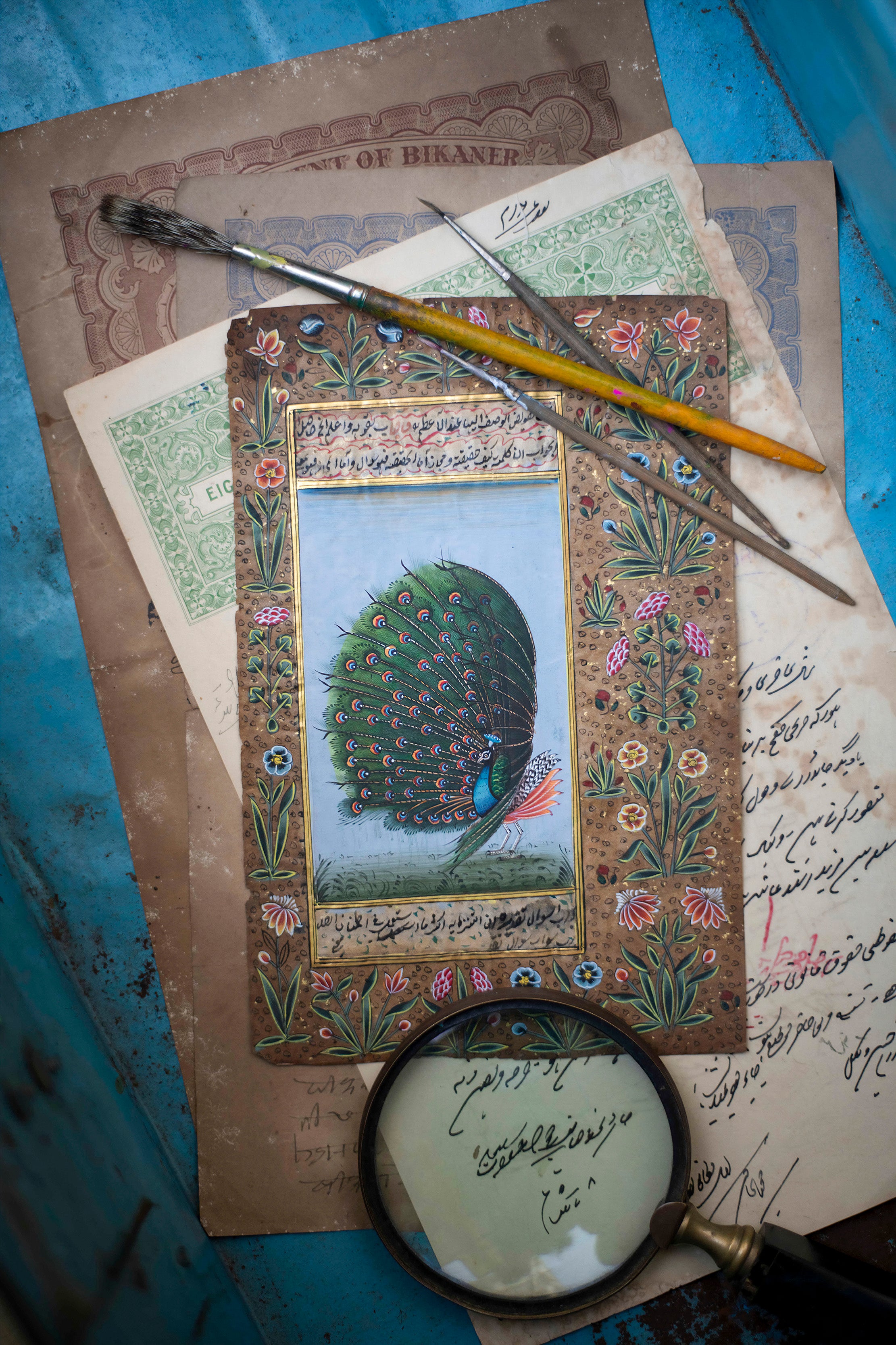 This delicate miniature is hand-painted by master artist Prakash Paliwal. Here he has created a mesmerizing composition of a peacock dancing joyfully in a lush jungle, using opaque pigments on old rice paper. The tradition of painting flora and fauna was commonly observed in Mughal miniature manuscripts in India. Prakash Paliwal takes forward this tradition and creates a unique imagery of fauna that brings forth naturalism and mysticism together. The birds appear all by themselves, almost ethereal which was a common theme in Mughal miniatures, which was to elevate the common.