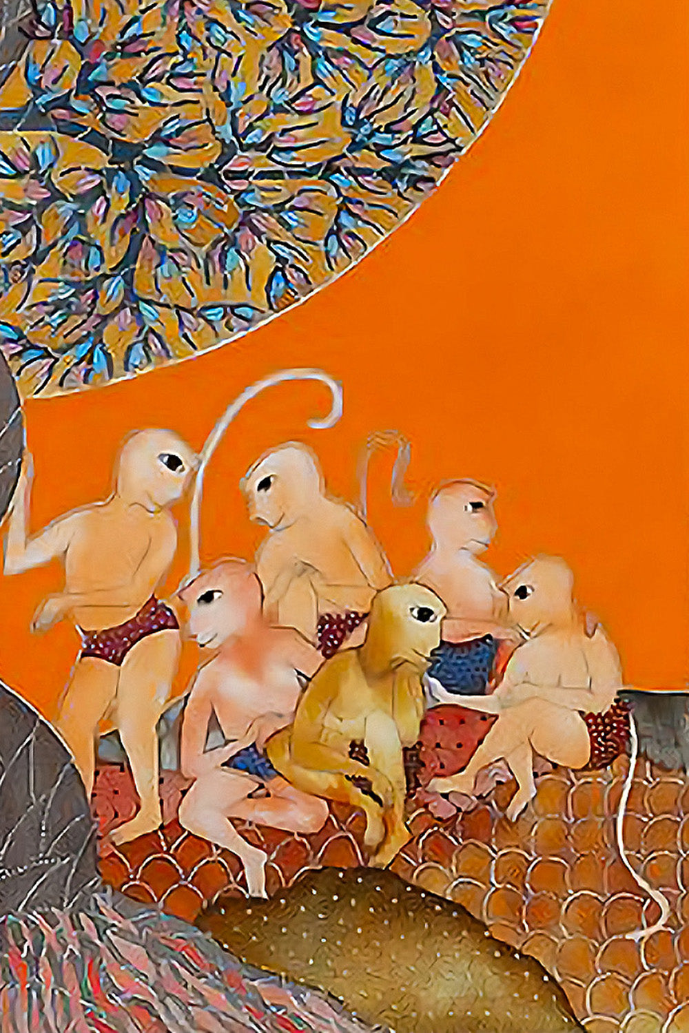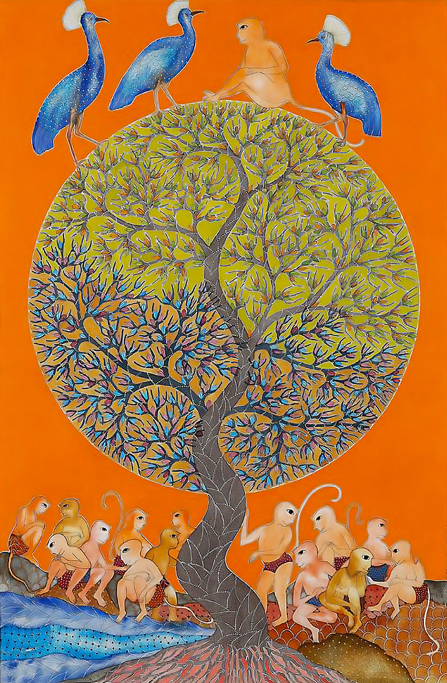 "This artwork hand-painted by Venkat Shyam is made in the tradition of Gond art. Animals have been an important motif in the Gond belief system. Their representation on the walls was thought would bring luck to the house; one of the most prominently used animals in Gond art are monkeys. In this painting Venkat Shyam depicts two Doves. Monkeys or Vanars as there are known in the Hindu Mythos play a key role in the progression of the Mahabharata particularly in the construction of the bridge that takes Ram and his army to Lanka. Here we see two parties of monkeys gathered around the tree of life which in itself is incredibly significant in Hinduism. The image is painted in the traditional Gond style which involves fine lines, dots, and dashes but the composition itself is unique to Venkat Shyam who has over the years developed his signature style of traditional entwined with modern. The colorful palette comprises natural pigments drawn on canvas sheets which is a 20th-century phenomenon as the Gond paintings were produced on mud walls."