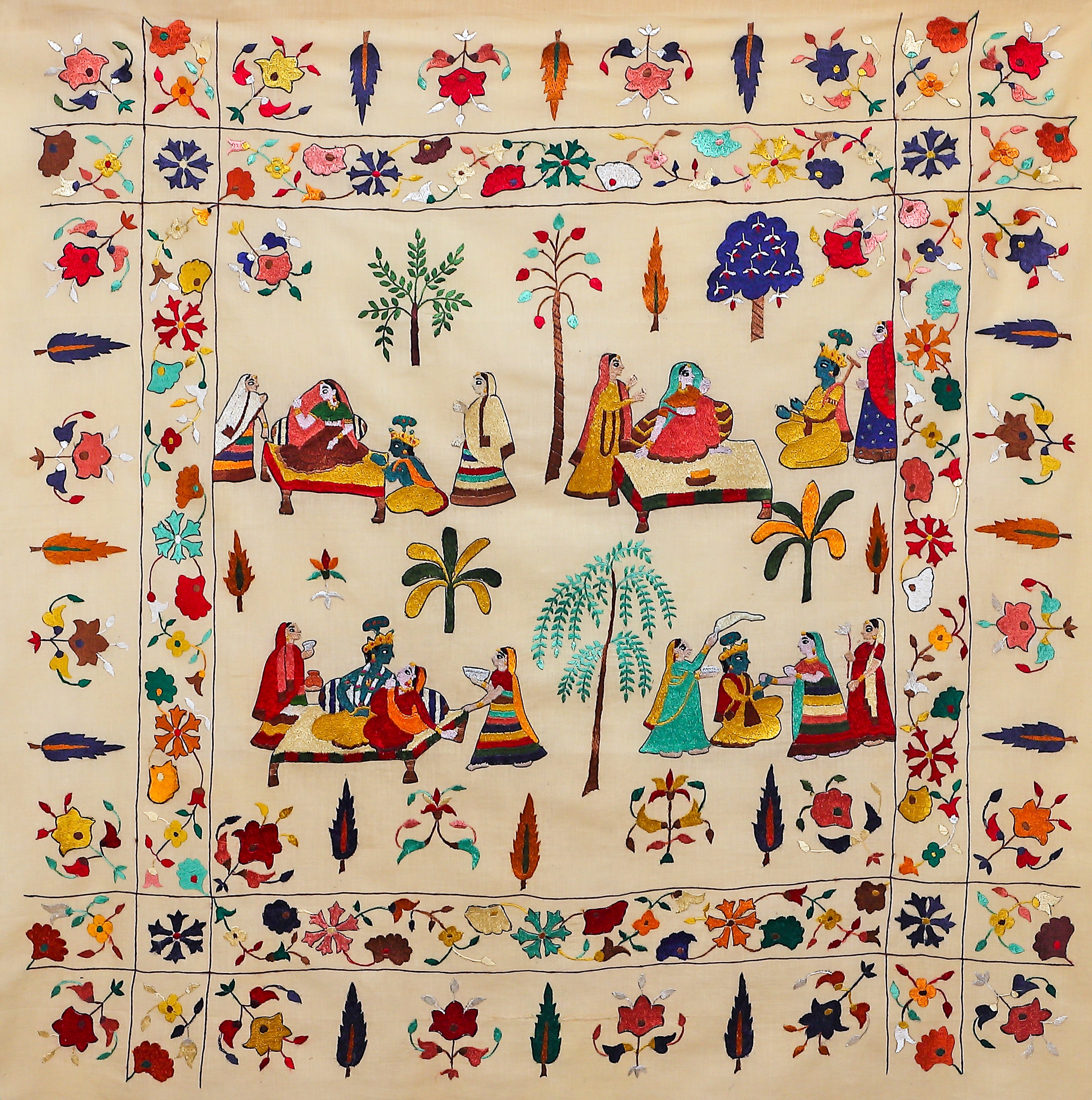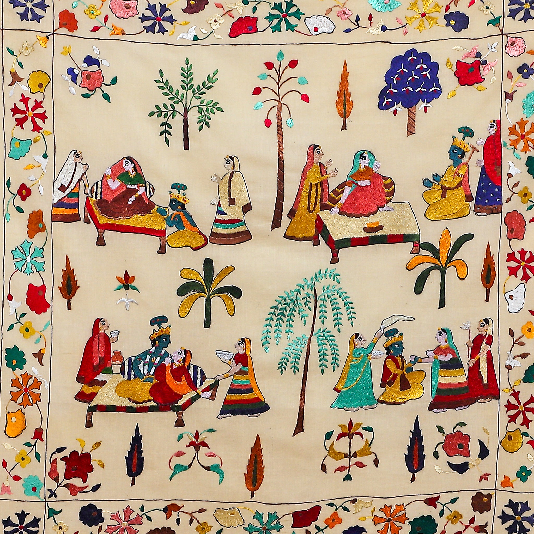"Padma Shri Lalita Vakil's Nayika Bhed is a vibrant tapestry woven from threads of love, longing, and the delicate nuances of the female experience. This captivating Chamba Rumal embroidery, rendered on cotton cloth, delves into the eight classifications of Nayikas (heroines) in Indian classical literature, each embodying a distinct facet of love and womanhood. At the center of the composition, eight female figures, their faces expressive and postures graceful, radiate outward from a central point. Each Nayika is adorned with vibrant attire and distinct symbols that reflect her unique characteristics. The Abhisarika, the bold heroine who ventures out to meet her lover, clutches a lamp and wears fiery red, while the Swadhinapatika, the independent woman, stands tall with a confident gaze. The Vasakasajja, the woman pining for her absent lover, sits amidst wilting flowers, her expression one of melancholic longing. Surrounding the central figures, a verdant paradise unfolds. Lush green foliage, embroidered in delicate stitches, creates a tranquil haven, reminiscent of the idyllic settings often associated with romantic poetry. Delicate birds, their plumage shimmering with color, flit amongst the leaves, adding a touch of whimsy and movement to the scene. In the distance, snow-capped peaks pierce the azure sky, anchoring the composition with a sense of grandeur and timelessness. The borders of the Rumal are adorned with intricate floral motifs and geometric patterns, echoing the vibrant hues and delicate stitching of the central scene. The use of double-sided do-rukha stitching, a hallmark of Chamba Rumal embroidery, adds depth and texture to the artwork, blurring the lines between observer and participant. Each meticulously placed stitch contributes to the overall harmony and richness of the composition. "