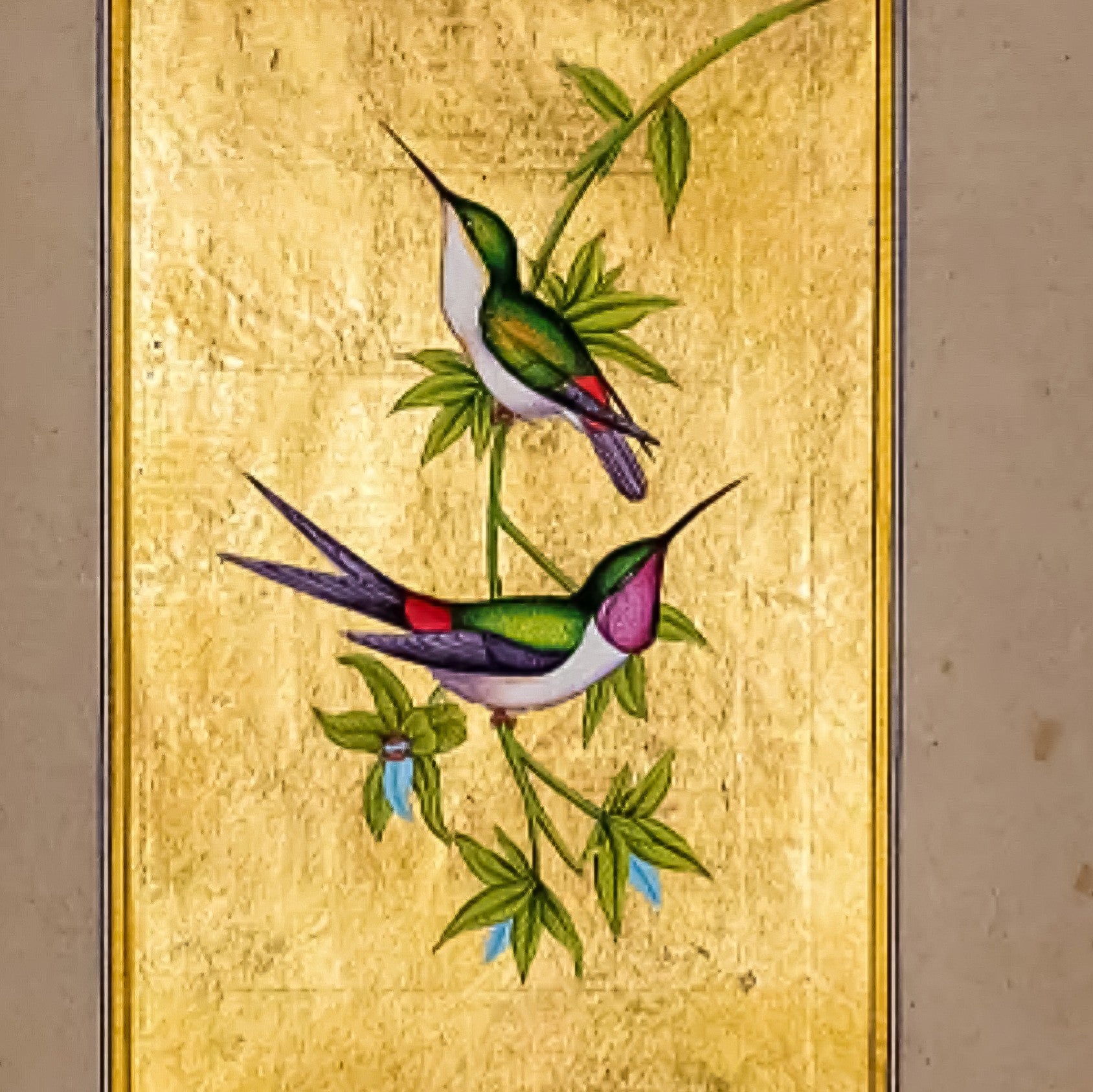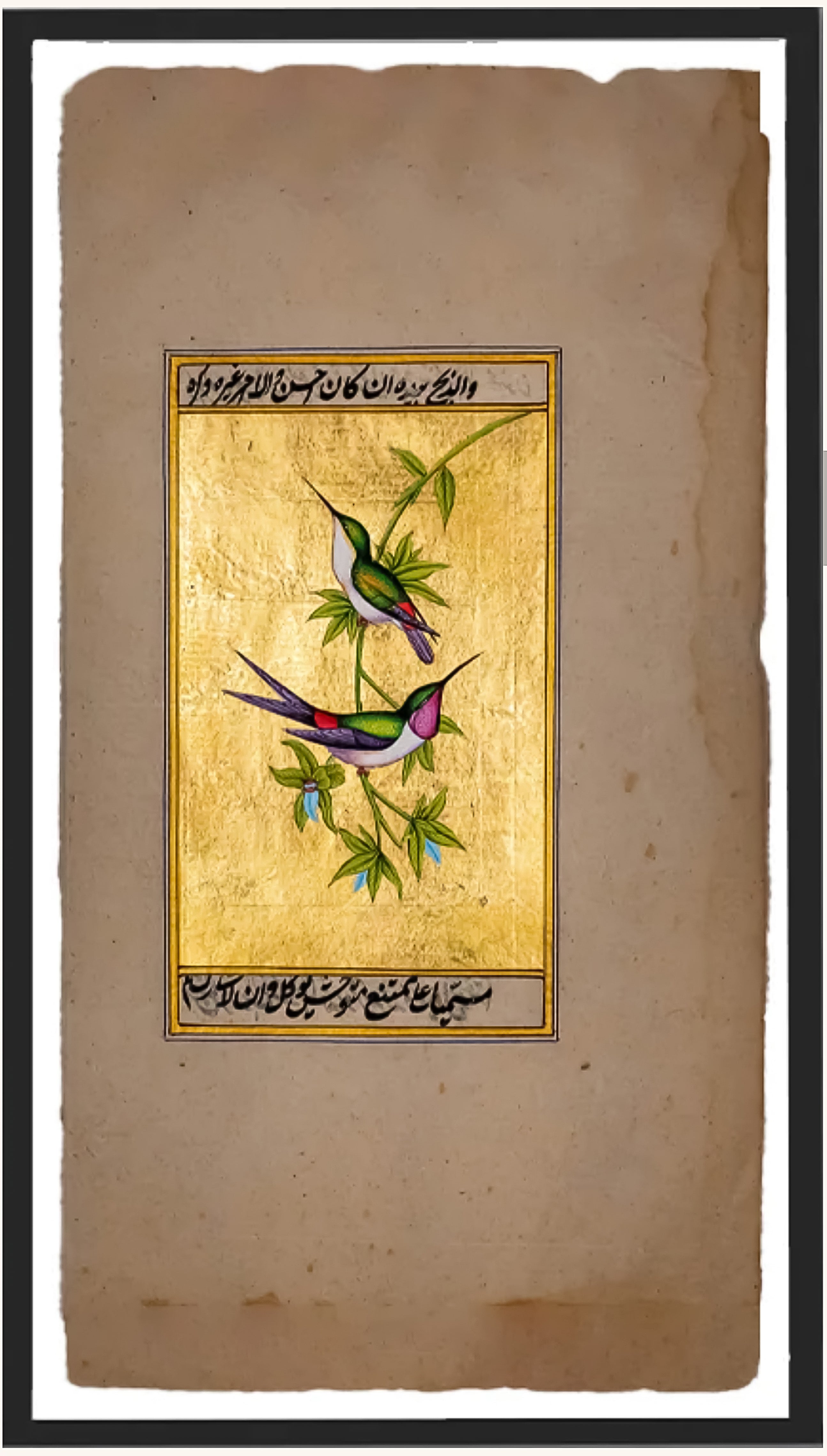 This delicate Mughal miniature is hand-painted by National award-winning artist Mohan Prajapati. Here he has created a mesmerizing composition of two hummingbirds perched delicately on a slender branch, using opaque pigments which are heightened with the use of real gold on old rice paper. The tradition of painting flora and fauna was commonly observed in Mughal miniature manuscripts in India. Mohan Prajapati takes forward this tradition and creates a unique imagery of birds that brings forth naturalism and mysticism together. The birds appear otherworldly, almost ethereal which was a common theme in Mughal miniatures, which was to elevate the common.