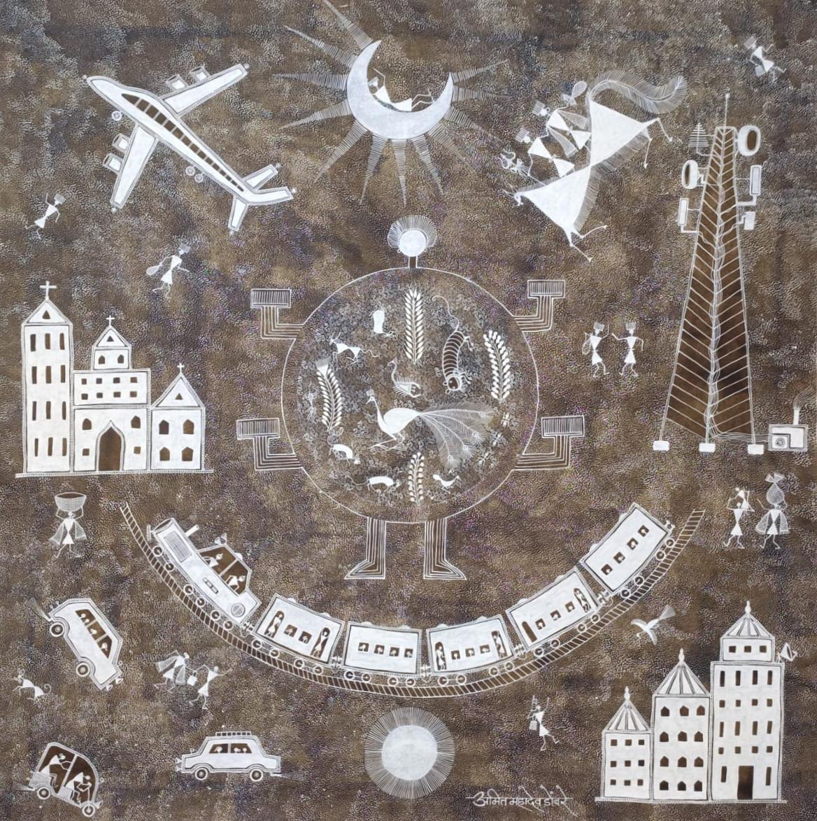 "Born on August 17, 1985, in Dahanu, Maharashtra, Amit Dombhare draws inspiration from his Adiwasi Warli roots. With over 20 years of artistic experience, he embarked on his Warli painting journey in the year 2000. Learning the traditional craft from his grandfather, Jethya Dombhare, and later under the guidance of acclaimed artist Anil Vangad, Amit Dhombare's work reflects a deep connection to his cultural heritage. Using traditional materials such as canvas cloth primed with cow dung and colors derived from rice paste mixed with neem, His artworks capture the essence of Warli traditions. Unlike conventional Warli compositions, he brings a unique perspective, infusing modernity and technology to showcase the evolving life in his community. Amit Dombhare's artistic journey extends across renowned platforms, including participation in the National Craft Museum in Delhi and exhibitions at Delhi Haat. His creations have captivated audiences in diverse cities such as Pune, Jaipur, Mumbai, Chandigarh, Mysore, Indore, Bhopal, Goa, Haryana, Hyderabad, Gwalior, Dehradun, Odisha, and more. Through these exhibitions, Amit has woven a rich tapestry of Warli art, transcending regional boundaries and sharing the cultural legacy of his Adiwasi Warli heritage. "