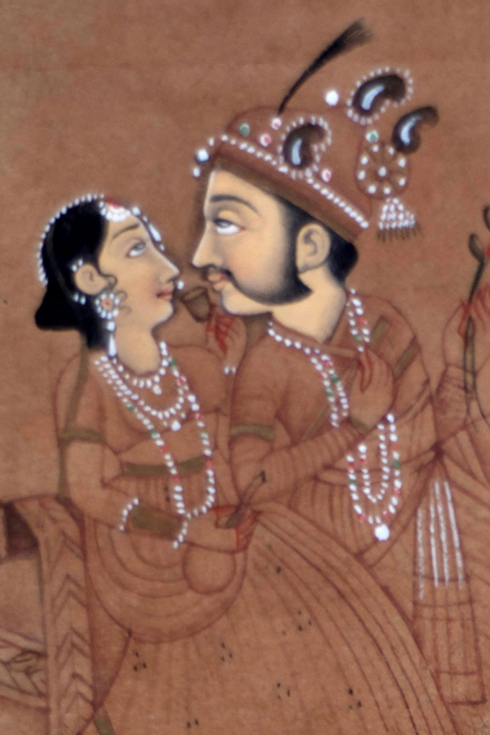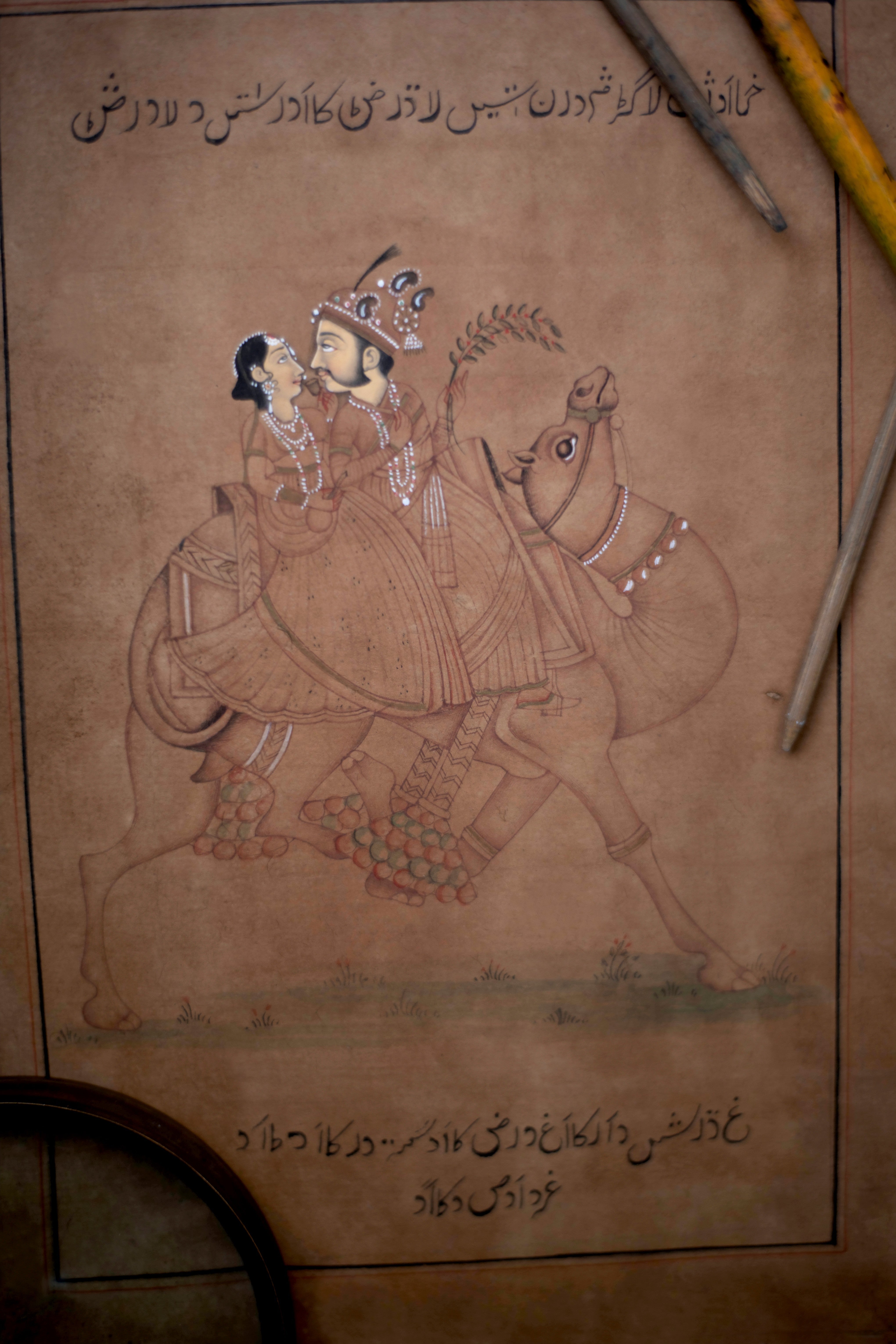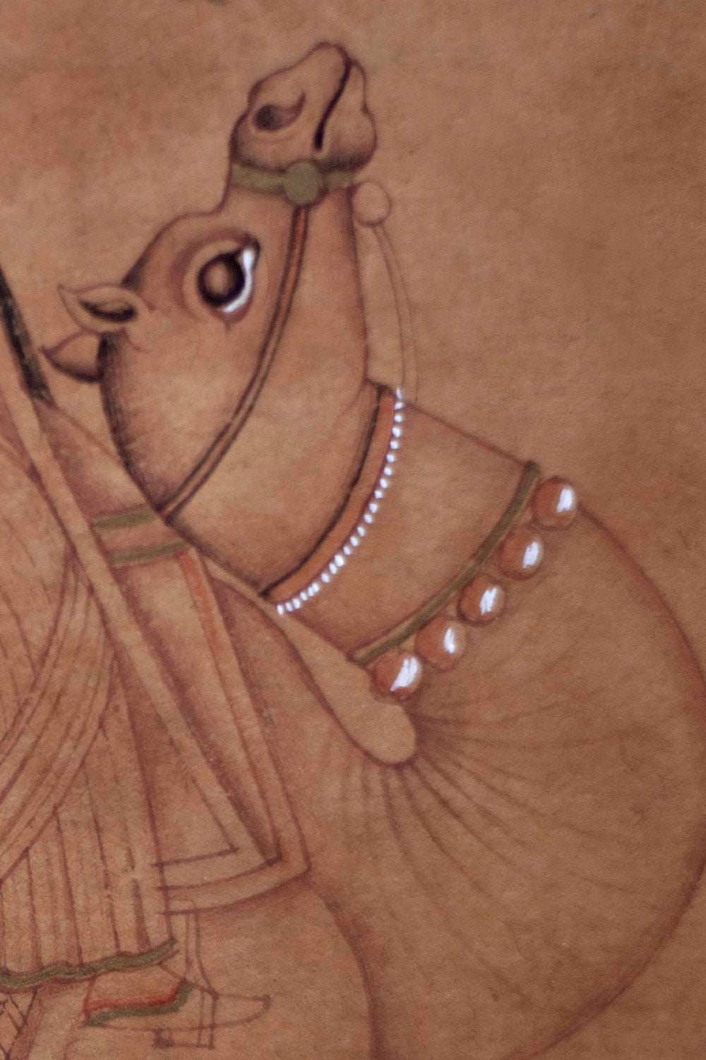 This beautiful Mughal miniature painted by Prakash Paliwal depicts a scene from the Rajasthani folklore story of the two lovers Dhola and Maru. Here the lovers are finally united after spending most of their lives apart from each other. As they ride off together to a hopeful future they look at each other instead of the path ahead establishing that the true destination has always been each other.