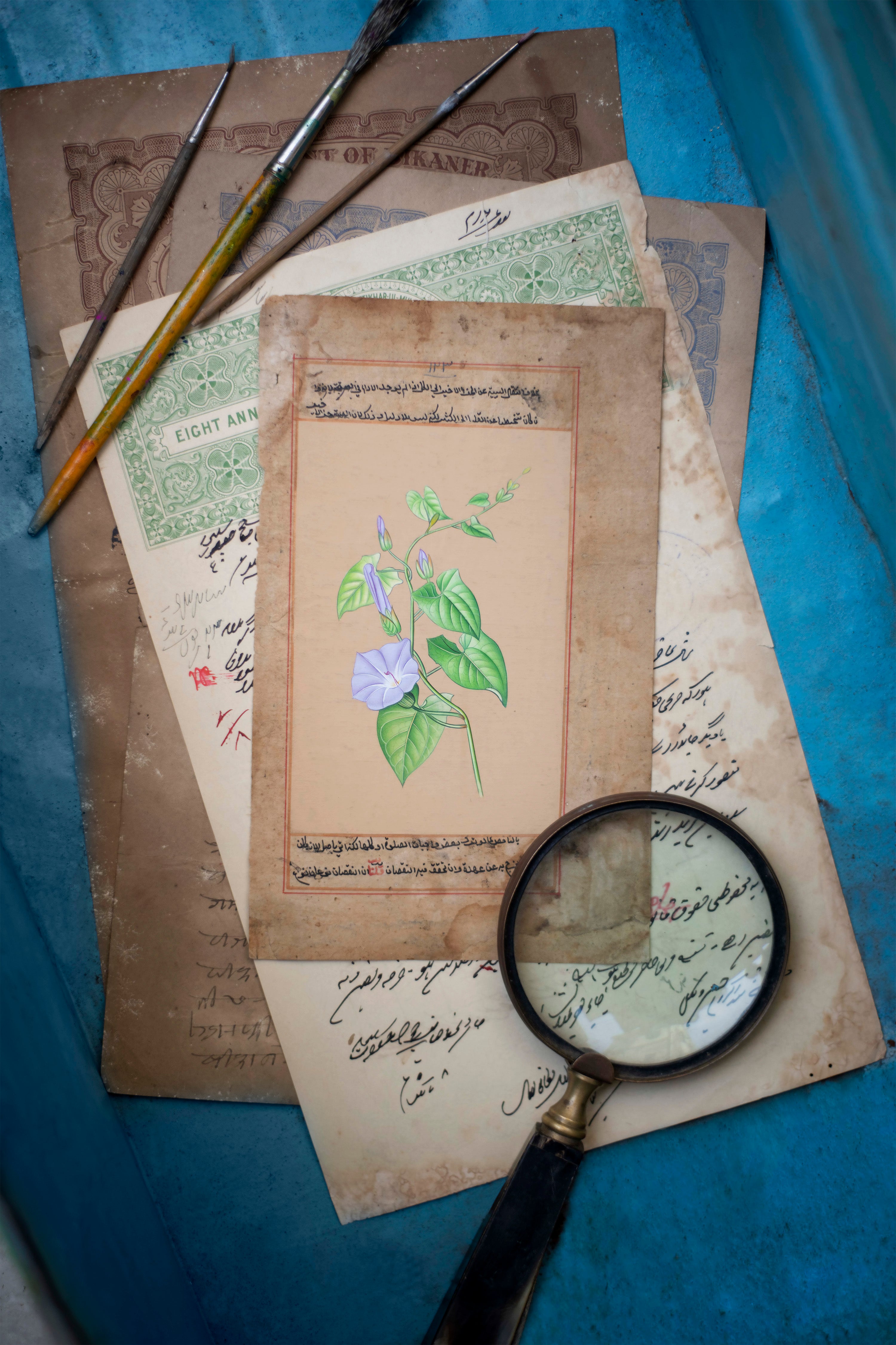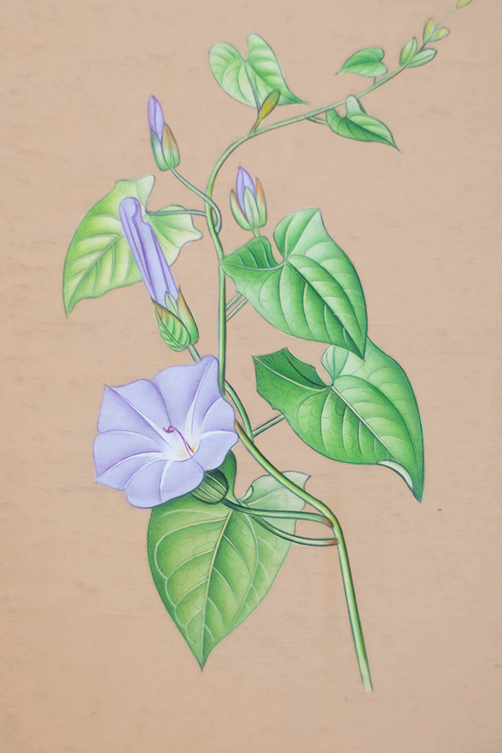 In this beautiful exhibition of exquisite detail Prakash Paliwal paints a delicate violet flower that resembles a morning glory. The Mughal style of miniature paintings bloomed not just with depictions of royalty and courtly life, but also with a vibrant tapestry of botanicals which is given fresh life through his hands.