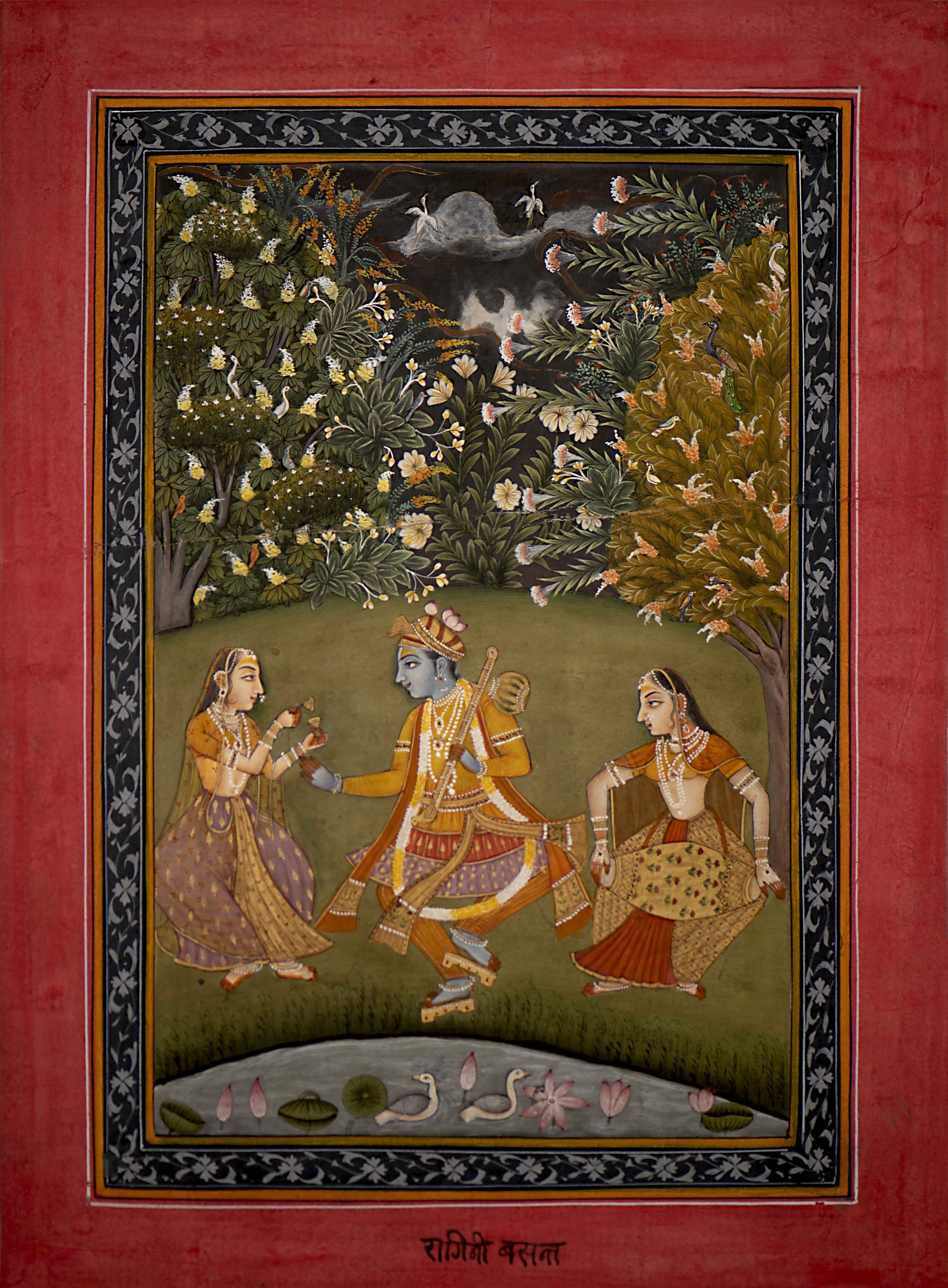 "Rajasthani painting, an exquisite style of miniature art, blossomed primarily within the independent Hindu realms of Rajasthan in western India during the span of the 16th to 19th centuries. Rooted in Western Indian manuscript illustrations, this art form underwent a transformative journey, influenced by the Mughal aesthetic in its later stages of development. Distinguished by its distinct attributes, Rajasthani painting stands apart from Mughal painting—both from the imperial studios in Delhi and the provincial courts. It boldly embraces vibrant hues, along with an abstract and stylized portrayal of the human form, complemented by ornate renditions of landscapes. Reflecting the burgeoning wave of devotional fervor within Hinduism, these miniatures predominantly narrate the enchanting tales of Lord Krishna, and his beloved companion, Radha. While also incorporating scenes from India's epic narratives, musical modes (Ragamalas), and depictions of heroines (Nayikas), the 18th century introduced courtly portraits, court scenarios, and hunting scenes into the repertoire. Distinct schools have emerged based on style, including Mewar, Bundi (and its adjacent Kotah), Kishangarh, Bikaner, Jaipur, and Marwar, and even extending beyond the boundaries of Rajasthan to encompass Malwa painting, also known as Central Indian painting. "