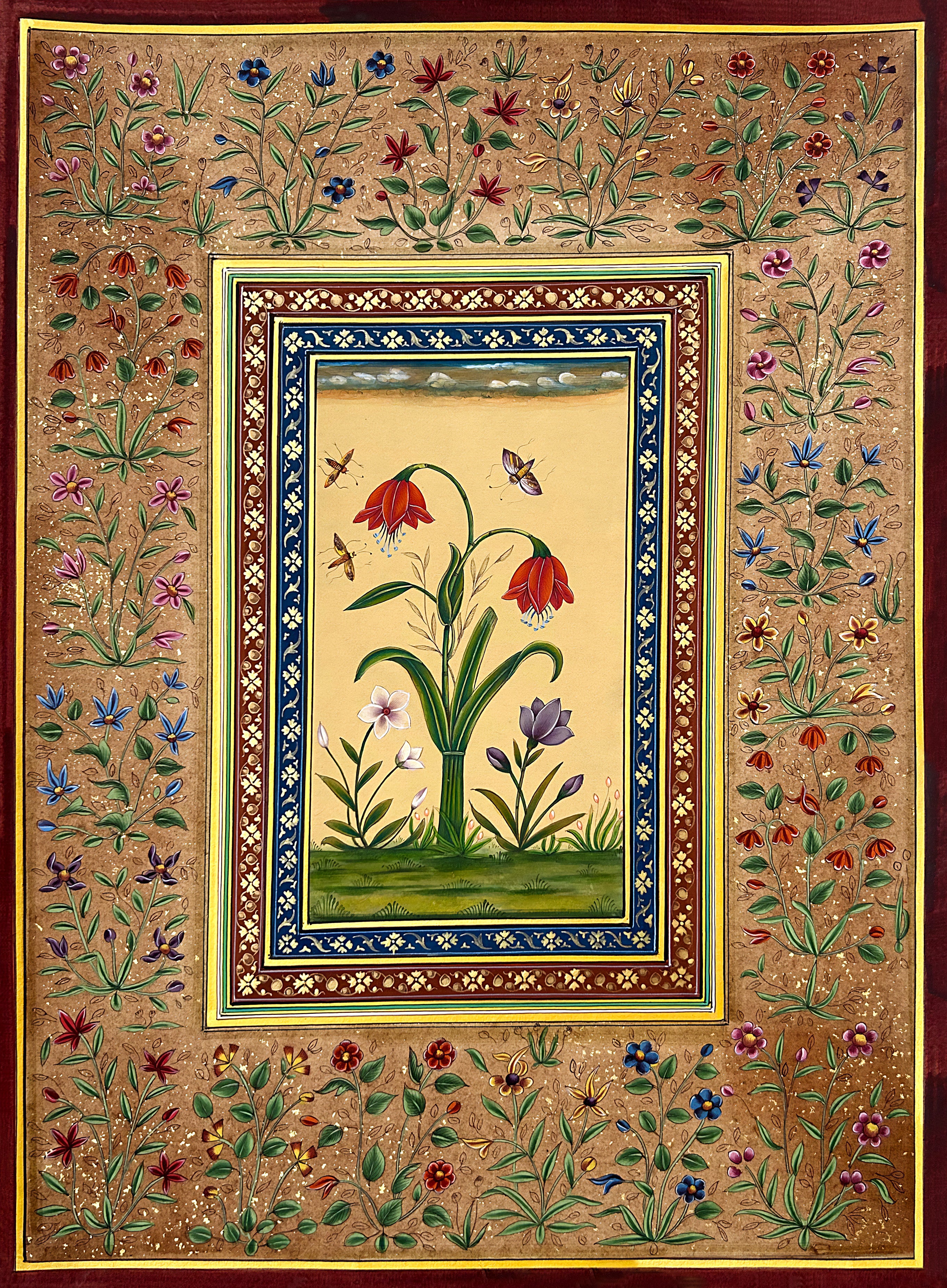 In Mughal miniatures, flowers transcended mere decoration, blossoming with symbolic meaning. Here Mohan Prajapati paints a stunning flower composition with the Red Amaryllis flower taking centre stage. This meticulous botanical language within the paintings enriched the narrative, offering a window into the Mughal perception of the natural world and its deeper connection to the depicted scene, however here the meaning is reserved only for the painter himself.