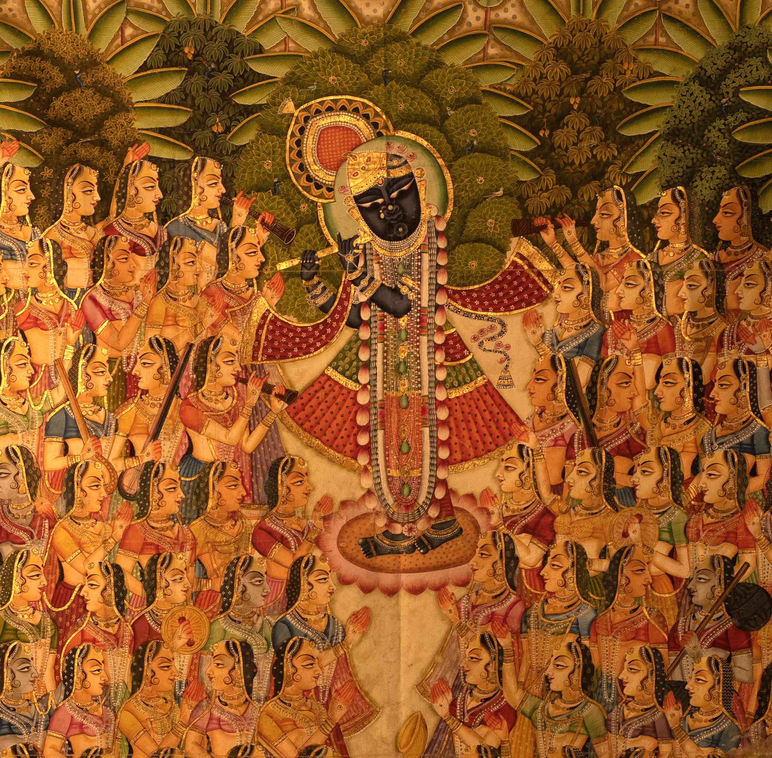 The artwork depicts the autumnal festival of Sharad Purnima, where Lord Shrinathji is painted performing Raas-Lila under the auspicious kadam tree along with his Gopis (female cowherds). The festival of Sharad Purnima marks the end of the Monsoon. The entire scene is set in a lush garden filled with mango and banana trees along with dancing peacocks peeking from the trees. The divine Ras is being witnessed in the sky above by various deities such as Indra-Shachi, and Shiv-Parvati flying in golden chariots centered by an image of Chandra Dev (Moon God). Dinesh Soni has taken elements from Rajput miniature traditions while painting female worshippers. He shows all the figures in vibrant colors and delicate features. The paintings arouse the feeling of Bhakti Rasa in the hearts of the viewers. The artist has used natural pigments and gold foil to illuminate the painting.