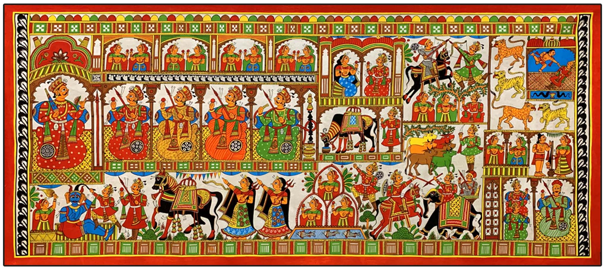 Phad painting is a traditional style of religious scroll painting, which is native to the state of Rajasthan. The word phad means “fold” in the local Rajasthani language, and thus refers to scroll paintings made on cloth, typically cotton or silk, which are then folded and unfolded during the performances of accompanying folk songs and stories. The paintings depict the tales of the local deities and heroes, particularly of Pabuji or Devnarayan who are worshiped by the Rabari tribe in Rajasthan. The Bhopas, the priest-singers within the tribe, carry the painted Phads along with them as mobile temples. They are usually done in bright colors with bold lines and exaggerated features and are about 20-30 feet in length and about 5 feet wide. The artists known as phad painters come from the Bhilwara district of Rajasthan and have a long history, with some scrolls dating back to the 17th century.