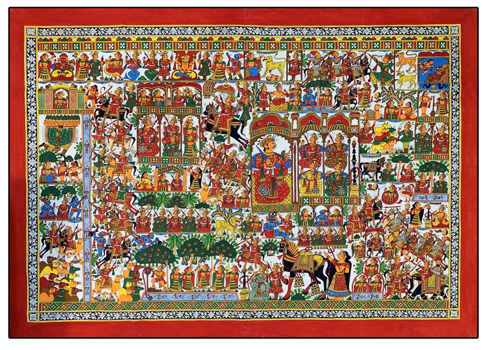 The artwork hand-painted by Kalyan Joshi, is made in the traditional style of Phad painting. The artist has depicted the epic of Pabuji which is an oral epic in the Rajasthani language illustrating the deeds of the folk hero-deity Pabuji Rathore, who lived in the 14th century. He came from a family of poor farmers but rose to become a powerful Rathore Rajput chieftain and warrior. Traditionally his tales were sung by a group of Bhopha bards and as such the artist has arranged this panorama of medieval Rajasthan where women, horses, singers, musicians archers, kings, and queens, all are arranged around the central outsized figure of Pabuji, who is shown on his magnificent black mare, Kesar Kalami, accompanied by his four great companions and brothers-in-arms. The artist has painted this image in the traditional Phad style of painting with the use of natural stone colors on cotton cloth. The palette consists of bright colors and bold lines and all the figures are shown having exaggerated features.