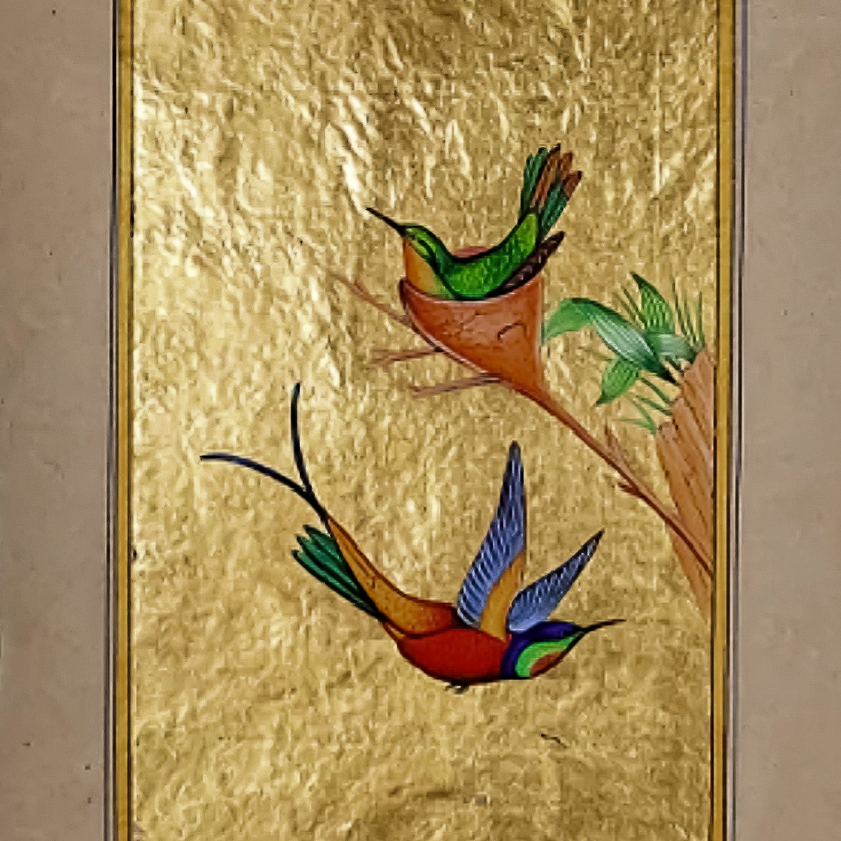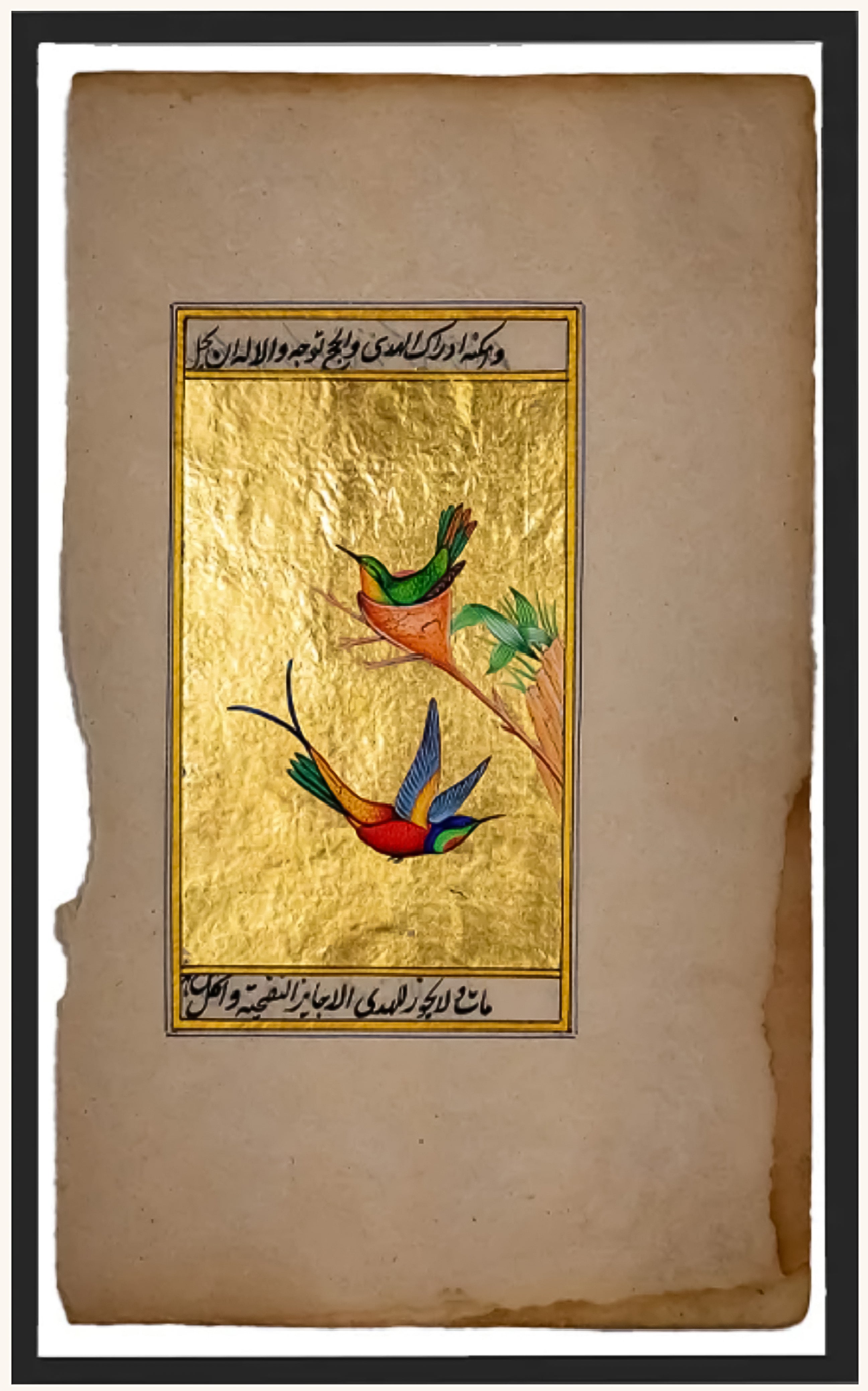 This delicate Mughal miniature is hand-painted by National award-winning artist Mohan Prajapati. Here he has created a mesmerizing composition of two brightly colored hummingbirds perched delicately on a slender branch, using opaque pigments which are heightened with the use of real gold on old rice paper. The tradition of painting flora and fauna was commonly observed in Mughal miniature manuscripts in India. Mohan Prajapati takes forward this tradition and creates a unique imagery of birds that brings forth naturalism and mysticism together. The birds appear otherworldly, almost ethereal which was a common theme in Mughal miniatures, which was to elevate the common.