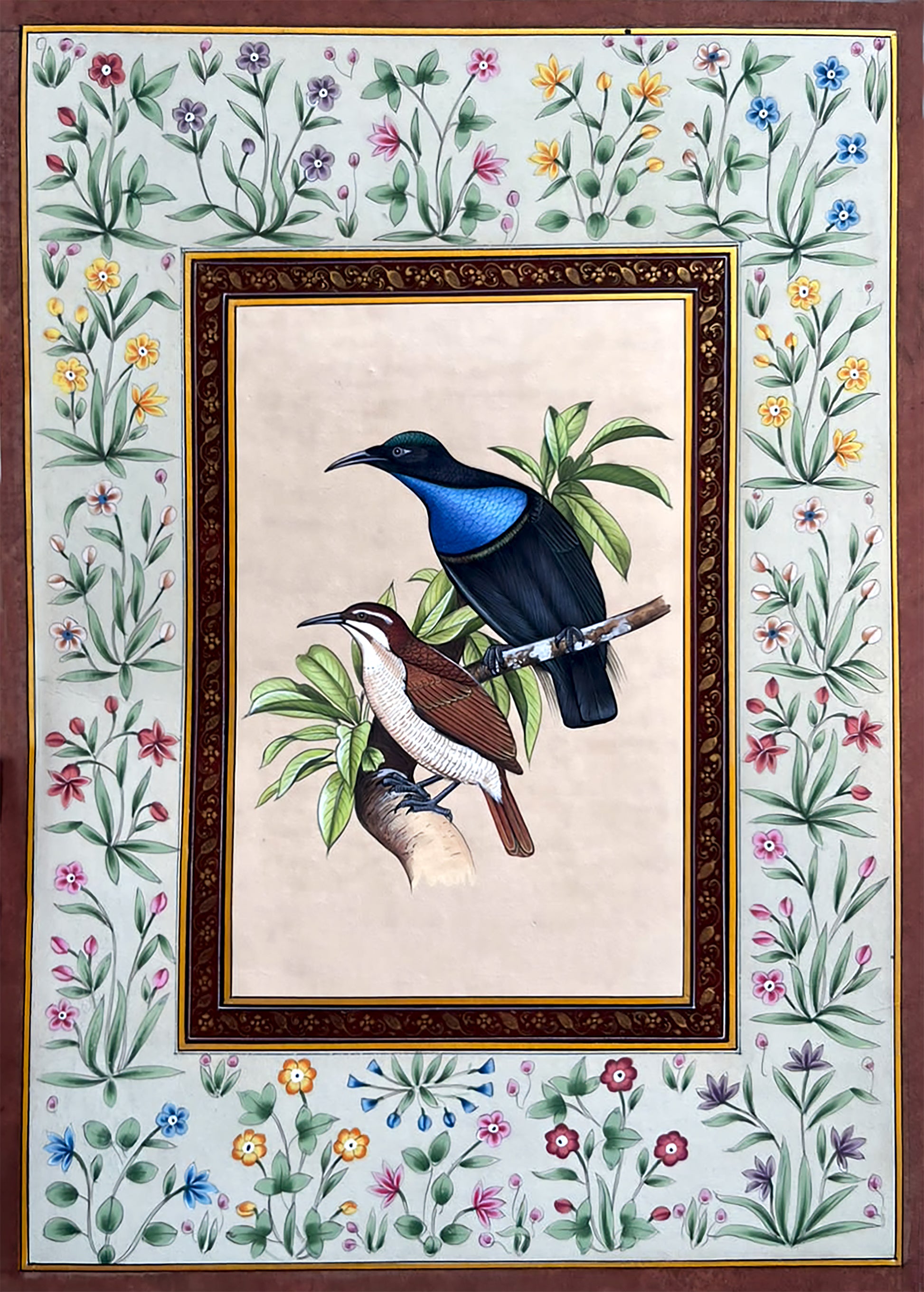 Mughal miniature artist Mohan Prajapati crafts a stunningly minimal scene of two birds caught in a moment of silence sitting on a tree branch. The two birds contrast each other, one rendered in shades of brown and the other in blues however they standout starkly against the neutral beige of the background. This minimalism is belied by the dense foliage that is found in the framing of the central painting.