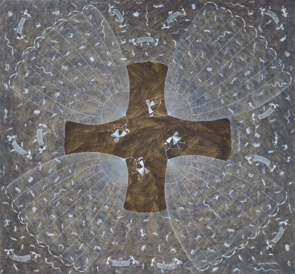 This work by Amit Dhombhare is a captivating example of contemporary Warli art. The painting features a central group of figures rendered in white against a background of unpainted cotton fabric. The figures appear to be standing or dancing in a circle, their arms raised overhead. The simple, geometric forms and bold outlines are characteristic of the Warli style. However, using white acrylic paint adds a contemporary element to this traditional art form. Cow dung pigment is a common material used in Warli art. It is believed to have sacred properties and helps to preserve the paintings. The use of white acrylic paint in this artwork is a departure from the traditional earth tones used in Warli art. This choice by the artist may reflect a contemporary artistic sensibility. Warli art is a tribal art form originating in Maharashtra, India. Traditionally, Warli paintings were created on the mud walls of homes and depicted scenes from daily life, mythology, and nature.