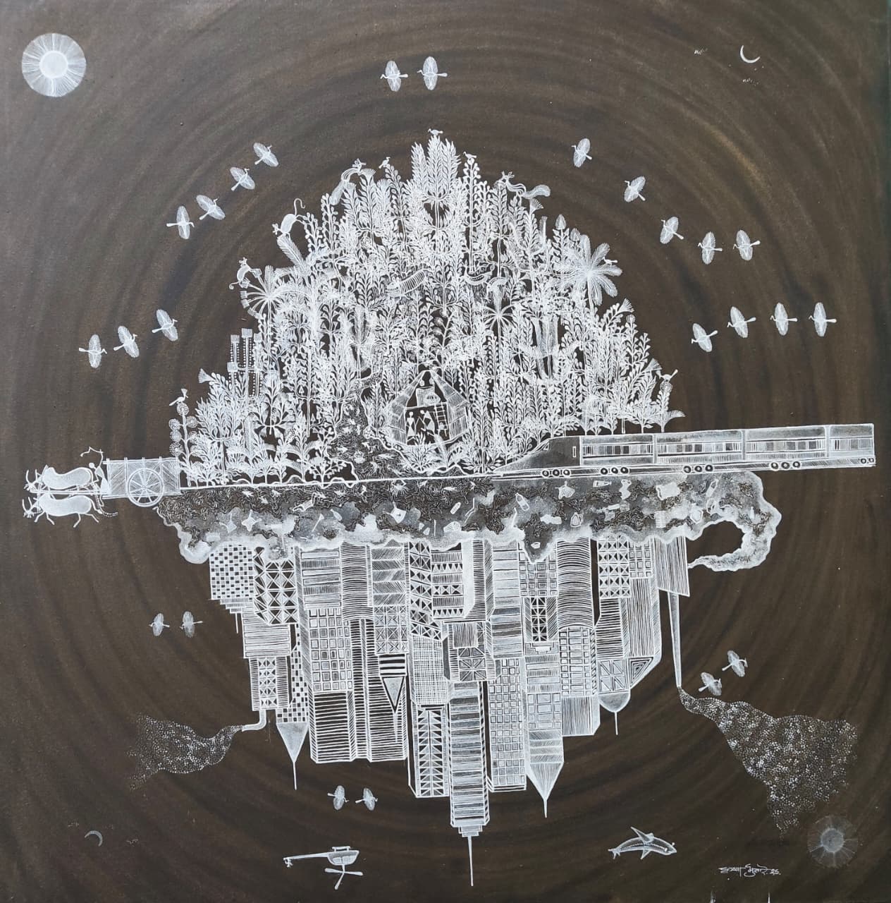This composition imagines the world as a revolving system where nature, city, and human movement coexist within a single circular rhythm. Forests, transport, birds, and urban structures merge into a continuous orbit, suggesting the fragile balance between growth and sustainability. The enclosing circle acts both as a boundary and a shelter, reflecting how modern life remains deeply connected to natural cycles despite rapid expansion.