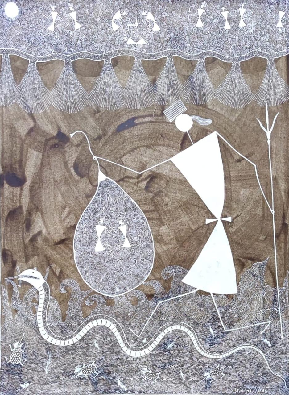 Born in 1983, Anil Vangad is a contemporary Warli artist with an artistic lineage that stretches back to his mother, who instilled in him the time-honoured traditional techniques of Warli art. Hailing from Maharashtra, Anil Vangad paints images from the daily life of the Warli tribes which are flanked by the Sahyadri Mountain range. Inspired by the Warli cave paintings, he references festivities, the Tarpa dance, patterns fields to flocks of birds in the skies. He uses traditional material where canvas cloth is primed with cow dung and colors are prepared using rice paste mixed with neem which is then applied with a bamboo stick. Unlike his fellow Warli artists, he offers minimal compositions, a flat perspective, and incorporates modernity and technology, mostly as an indication of how life in his village is changing. With 17 years of experience, he has worked on vast mural projects. He has been part of group shows such as The Tribal Arts, Arushi Arts (2020), On Display Now, Arushi Arts (2020), Art to Invest In Uncertain Time: Part 1, Arushi Arts (2020), Of Aesthetics & The Vernacular: An Insight Into Warli Art, Arushi Arts (2020), Spirit Of India Chapter II, curated by Ina Puri, Harrington Street, Kolkata (2022), and has several solo exhibitions in Singapore, Hong Kong, the US, UK, France, South Korea, India, and many other countries. His work is held in several prestigious public and private collections as well as acquired by auction houses such as Roseberry’s London. He is currently working out of his studio located in the rural area to the North of Mumbai.