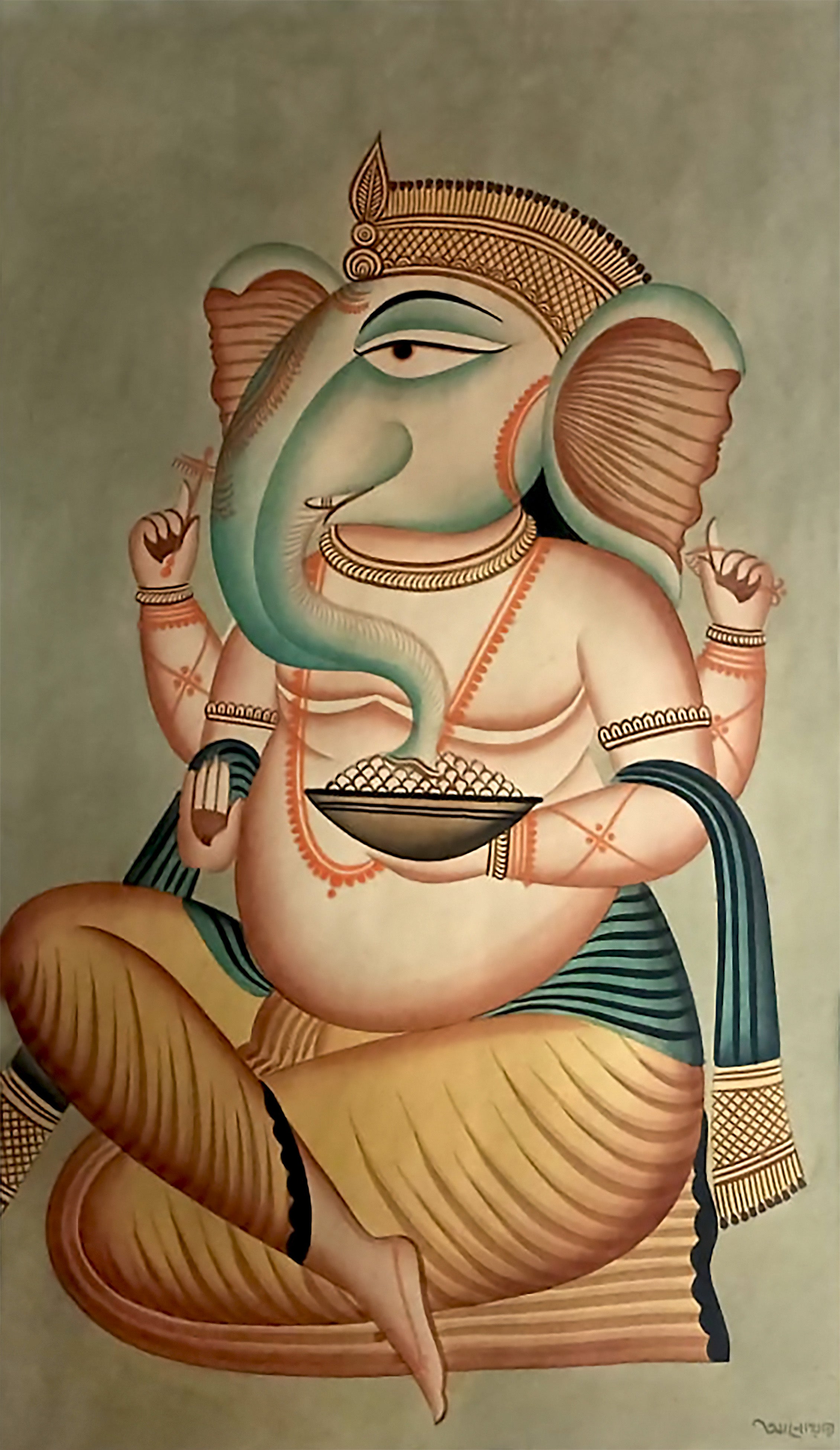 The Kalighat painting style originated in the early 19th century as a form of temple painting and though it has taken on varied topics over time, the core focus on depicting deities has not waned. In this painting, National Award winning artist Anwar Chitrakar has depicted child Lord Ganesha. Here Lord Ganesha is seen in the traditional Kalighat style with a flat perspective, dark black lines creating the forms and with elongated eyes that draw the viewer inexorably into the composition. The pale color of the background and the minimalism of the painting makes the deity who sits serenely at the centre of the composition, the focus of the painting.