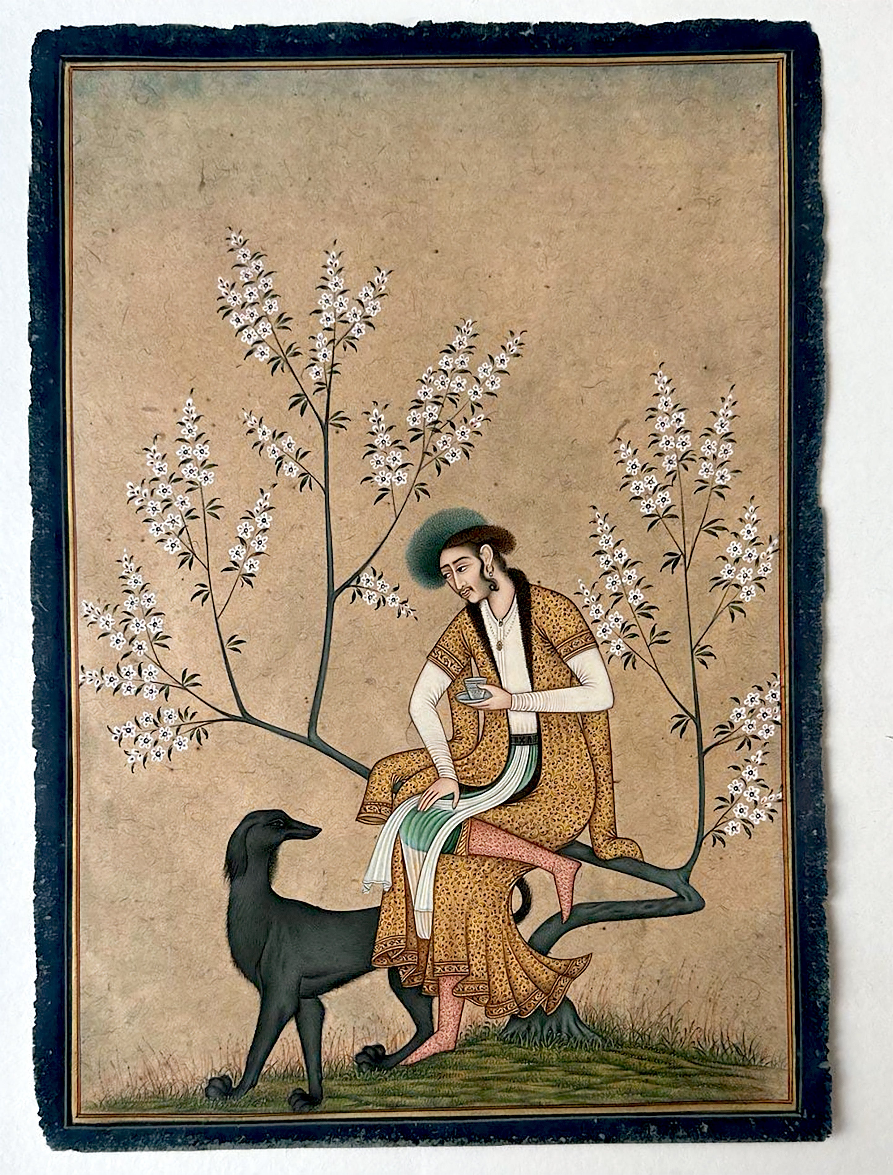 "Mughal miniature portraits were exercises in grandeur and meticulous detail. Emperors, adorned in dazzling jewels and rich fabrics, were depicted with both majesty and a touch of humanity. Artists employed fine brushes to capture intricate patterns on clothing and the glint of gemstones with precision. In this work Riyaz Uddin has depicted a finely dressed man relaxing against a tree while his faithful hound stands at the ready. Gestures are of great importance in this art style and are carefully chosen, a raised hand symbolizing power while a contemplative gaze offers a glimpse into the subject's inner world. The inclusion of the hound also implies the raised stature of the subject as very few would have access to such creatures during the time period and as they were often used for hunting, a common pastime for royalty. "