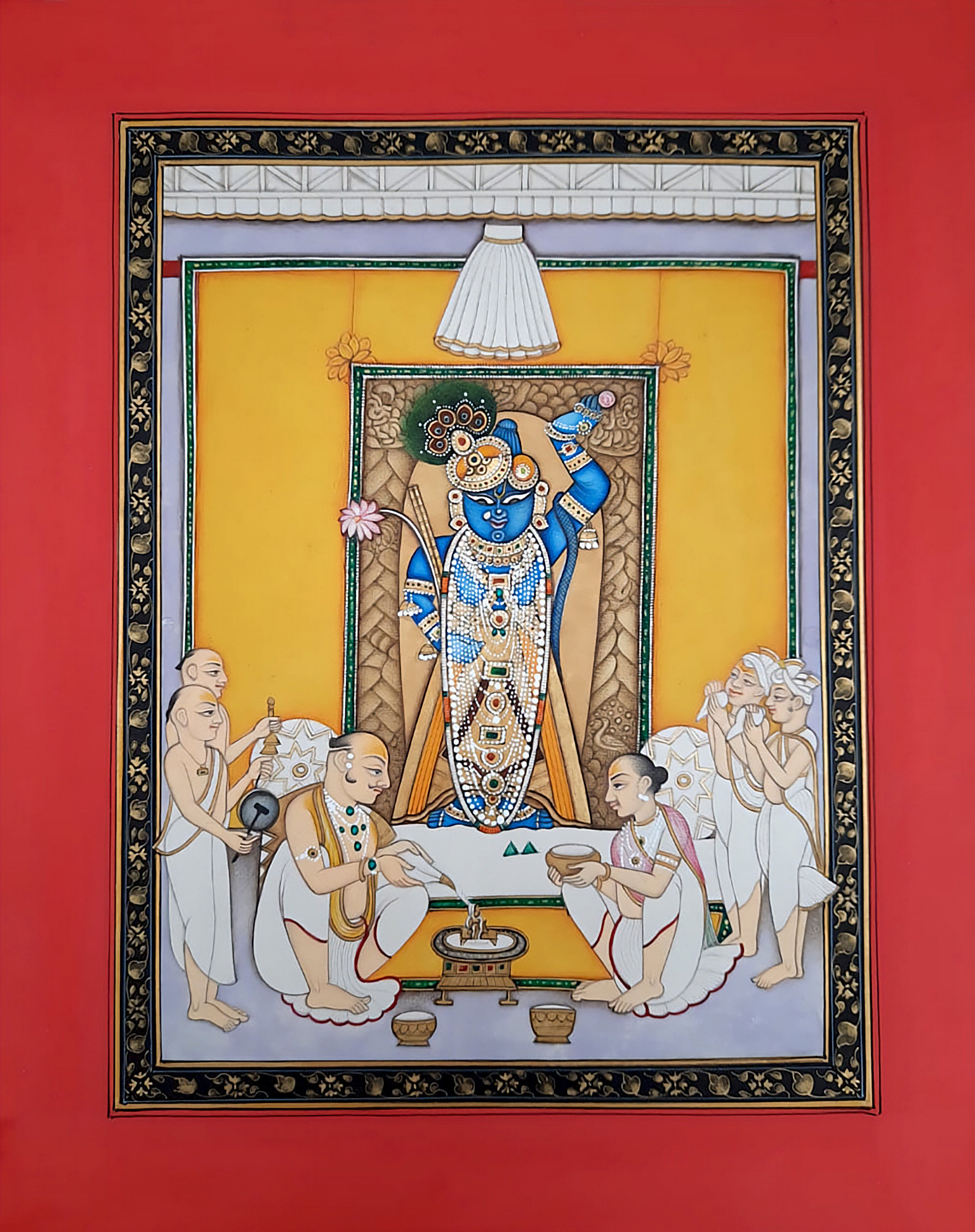 Shrinathji is the iconic representation of the child version of Lord Krishna and as such, is a common topic in many art forms. In this stunning work master painter Mohan Prajapati uses his signature style of Mughal miniature painting to this familiar scene. The painting is overflowing with saturated color from the iconic blue of Shrinathji’s skin to the vibrant yellow of the shrine walls.