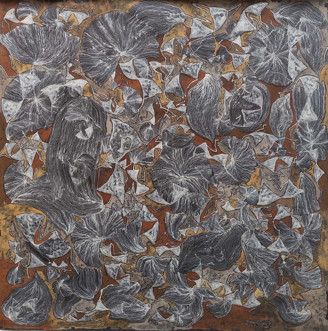 This densely packed surface is alive with swirling organic forms that overlap, collide, and dissolve into one another. Movement replaces stillness, suggesting migration, growth, decay, and regeneration happening simultaneously. Inspired by Warli rhythm but freed from traditional narrative structure, the artwork reflects the complexity of contemporary life—where identities, landscapes, and memories exist in constant flux.