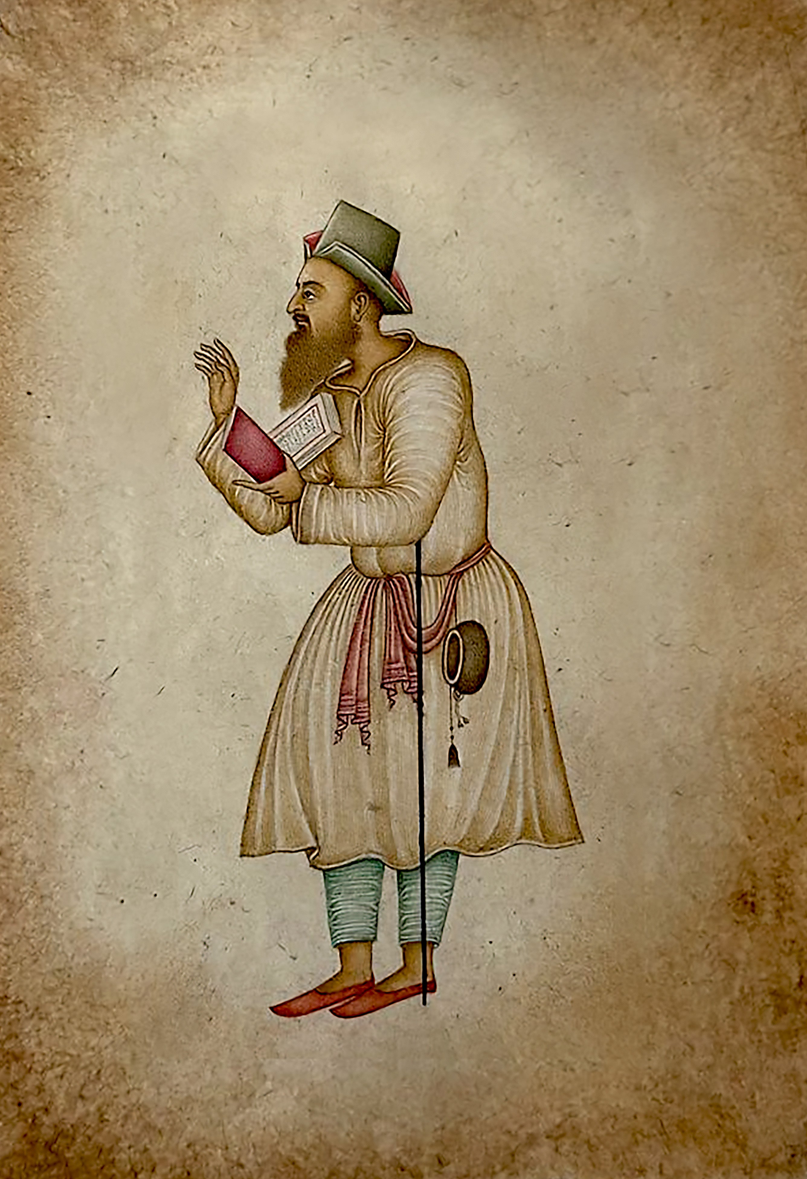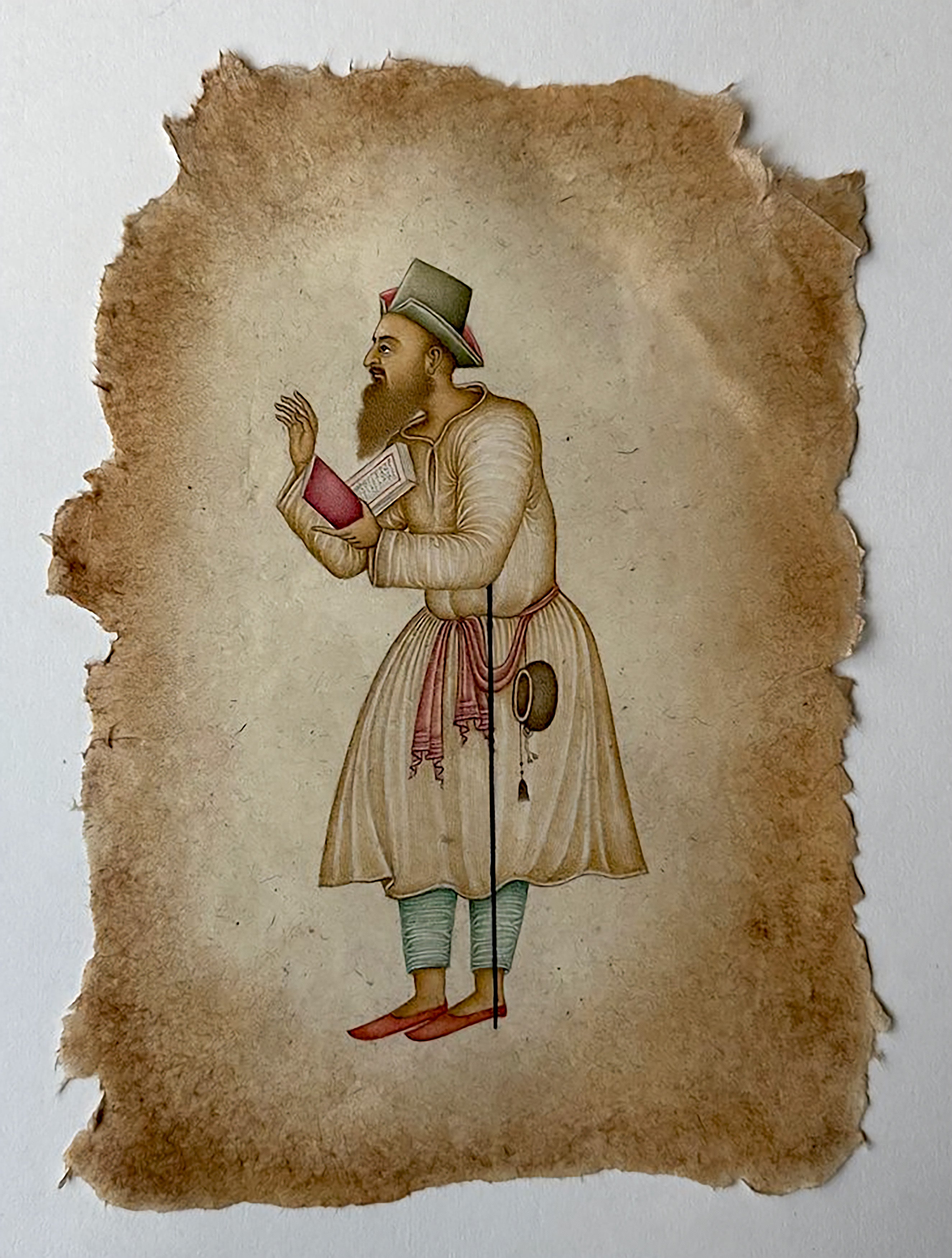 Mughal miniatures are often associated with royalty, not only for their ability to depict likenesses but also the gravitas that they gave the figures. In this instance Riyaz Uddin has rendered a simple portrait of a man in simplistic detail. While the finery that is often included in such portraits is missing the focus is given instead to the expression that the figure has. Gestures were carefully chosen, a raised hand signifying command while a thoughtful gaze might suggest contemplation. The borders of the painting seem to fade as if poorly defined giving the piece an air of incompleteness which further enhance the stark beauty of the work.