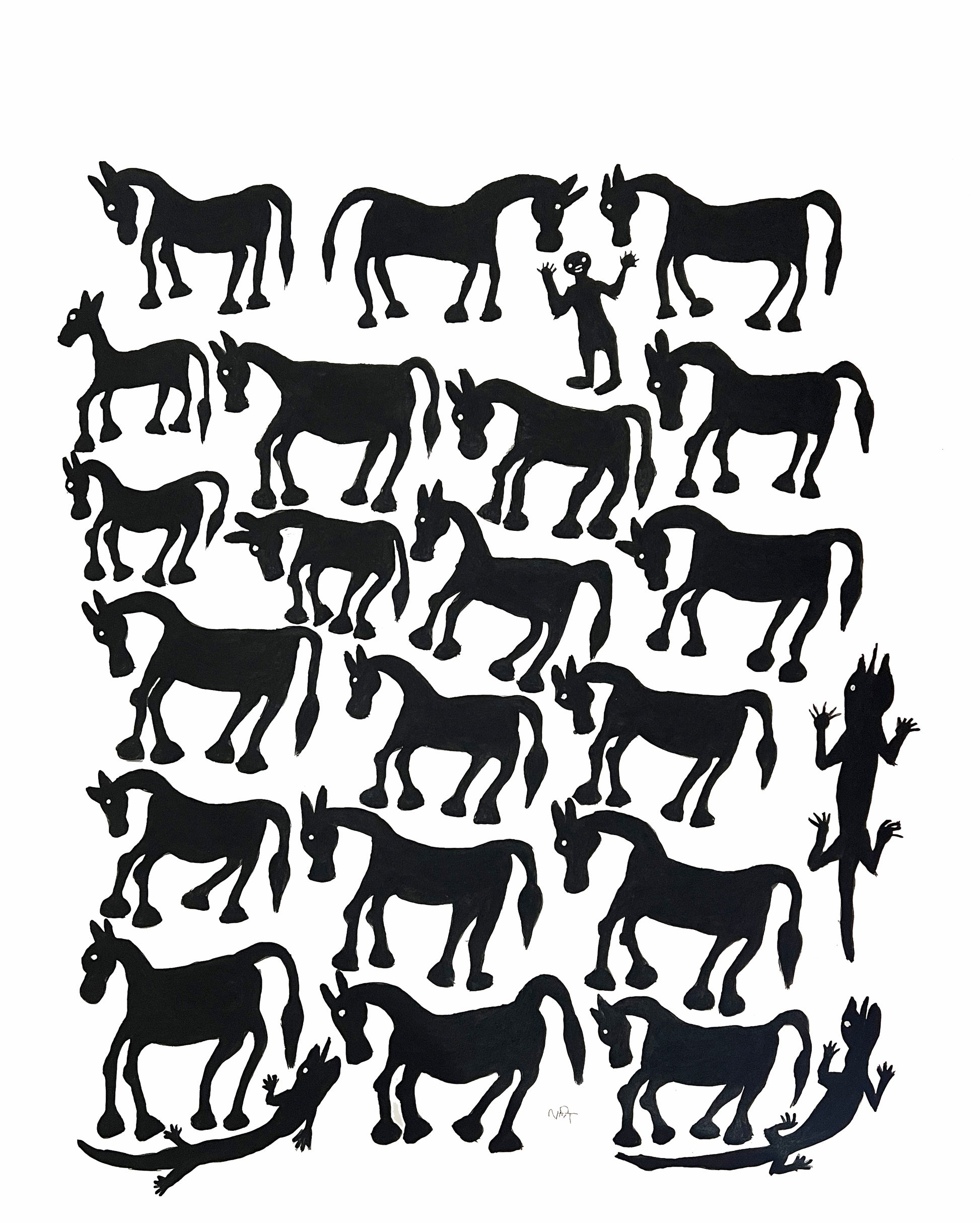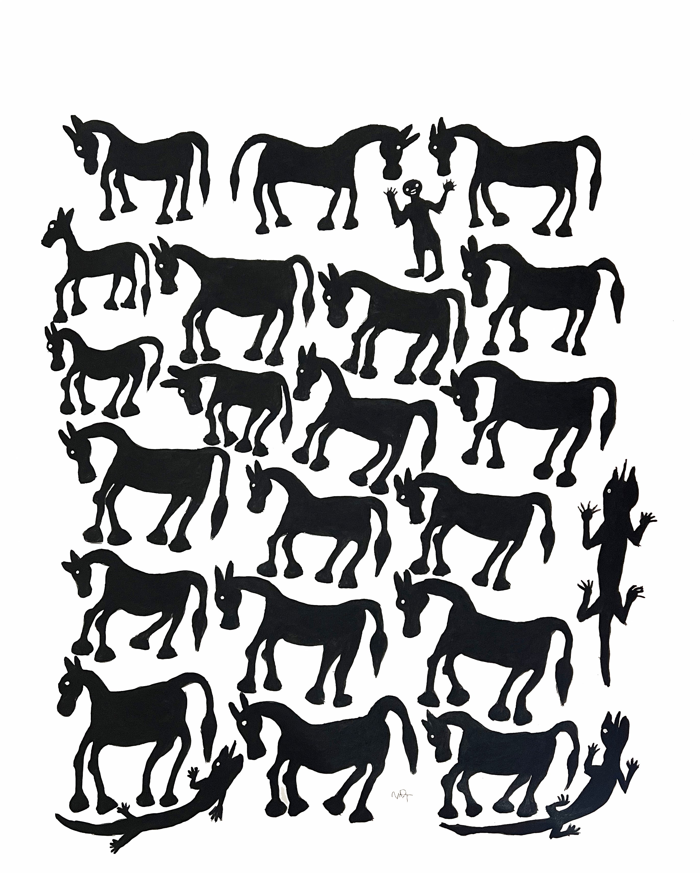 "This artwork depicts the sacred horses of the Pithora tradition, central to Bhil ritual painting and community worship. Rendered in bold black silhouettes, the horses appear in rhythmic repetition, forming a protective circle around human figures. In Bhil belief, Pithora horses are not merely animals but divine carriers—symbols of fertility, protection, and ancestral blessings. The stark contrast and simplified forms echo the ritual origins of Pithora paintings, traditionally created during ceremonial offerings to invoke harmony, prosperity, and well-being within the household. The presence of human figures among the horses reinforces the inseparable bond between the spiritual and social life of the Bhil community."