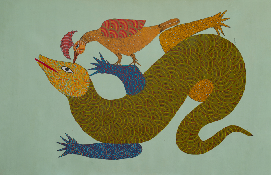 This composition presents a powerful animal form rendered through dense, rhythmic dot patterns characteristic of Bhil painting. The creature’s elongated body and expressive eye evoke a forest guardian—an ancestral being that embodies protection, instinct, and ecological balance. A bird perched atop the animal suggests symbiosis and dialogue between species, reinforcing the Bhil worldview where humans, animals, and nature coexist as equals. The layered patterns pulse with life, transforming the figure into a living landscape rather than a single being.